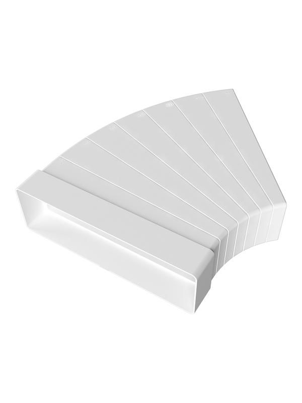 Колено плоское 55х110мм горизонтальное 511КРП изготовлено из пластика, который не меняет цвет и не подвержен старению. Материал обладает такими качествами как ударопрочность, стойкость к агрессивным щелочным и кислотным средам, атмосферным явлениям и относится трудновоспламеняемым материалам. Изделие выдерживает частые перепады температуры, контакт с жаром, влагой - этого достаточно, чтобы установить ее на кухне или в ванной комнате, где присутствуют данные факторы. Колено пластиковое Era 511КРП представляет из себя ничто иное, как фасонный элемент воздуховода плоской формы, обеспечивающий всевозможные перемены в направлении потока воздушных масс. Для соединения воздуховодов соответствующего сечения под углом от 3° до 48°. В зависимости от выбранного угла одна сторона соединителя подрезается. C каналами соответсвующего сечения соединяются напрямую.