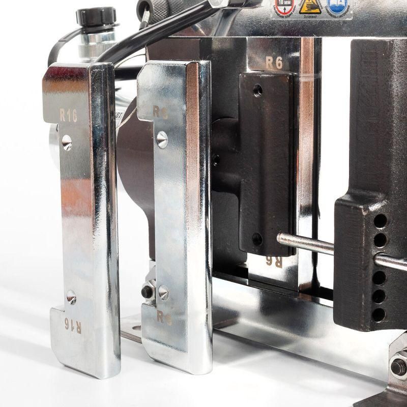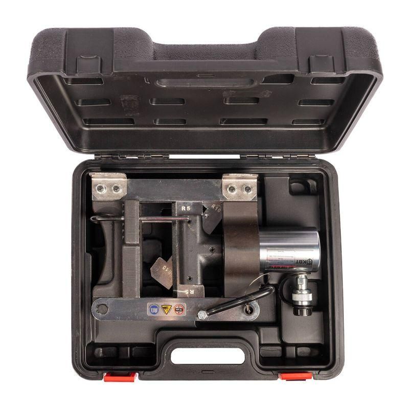 • Максимальная ширина шины: 150 мм • Максимальная толщина шины: • медная: 10 мм • алюминиевая: 12 мм • стальная: 6 мм • Два сменных пуансона с радиусом гиба 5 и 10 мм в комплекте • Минимальный угол гибки: 90° • Профиль гибки: П-образный, Z-образный • Шкала индикации угла гибки • Возможность стационарного крепления пресса • Максимальное усилие: 16 т • Присоединительная резьба: K 3/8" «розетка» • Вес инструмента: 17.30 кг • Упаковка: прочный пластиковый кейс • Габариты упаковки: 430х360х145 мм • Совместимость: любые гидравлические насосы «КВТ» с объемом рабочей жидкости не менее 0.60 л